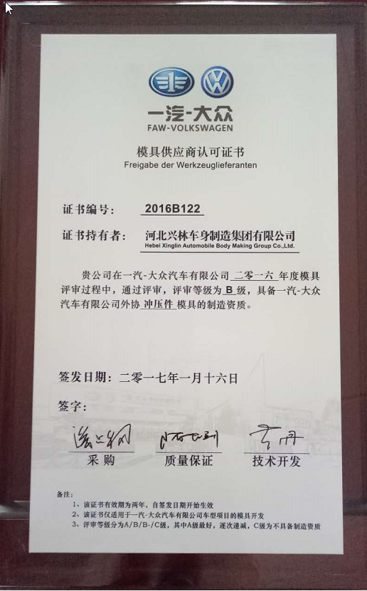 我公司獲得一汽-大眾模具供應(yīng)商認(rèn)可證書